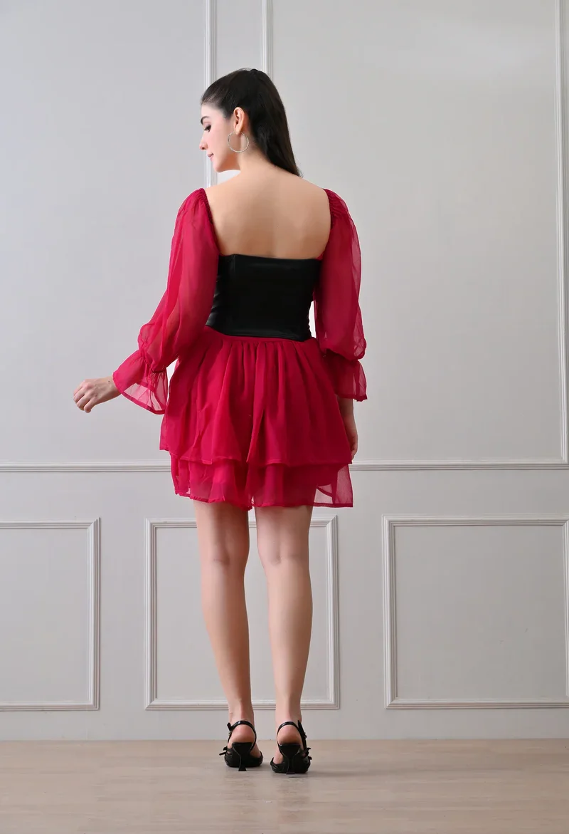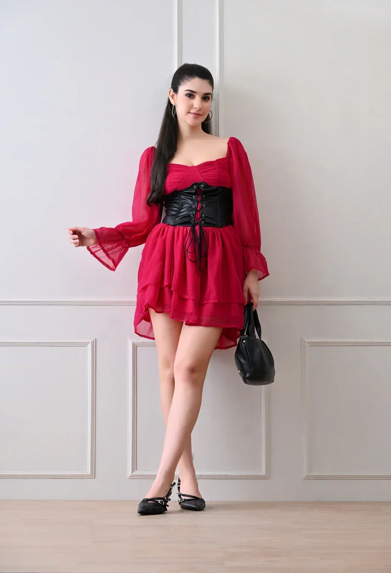 Add a touch of allure to your wardrobe with this beautiful corset mini skater dress with full sleeves. The corset-style bodice creates a dramatic, curve-hugging silhouette, while the full sleeves add a romantic, whimsical touch.