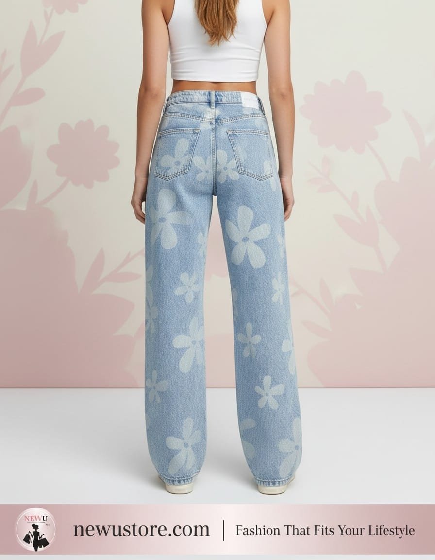 Step into spring with NewU’s Daisy Bloom Wide-Leg Jeans. Featuring a trendy light wash and bold floral patterns, these high-waisted jeans offer a relaxed fit for all-day comfort. Elevate your streetwear game at NewUstore.com.