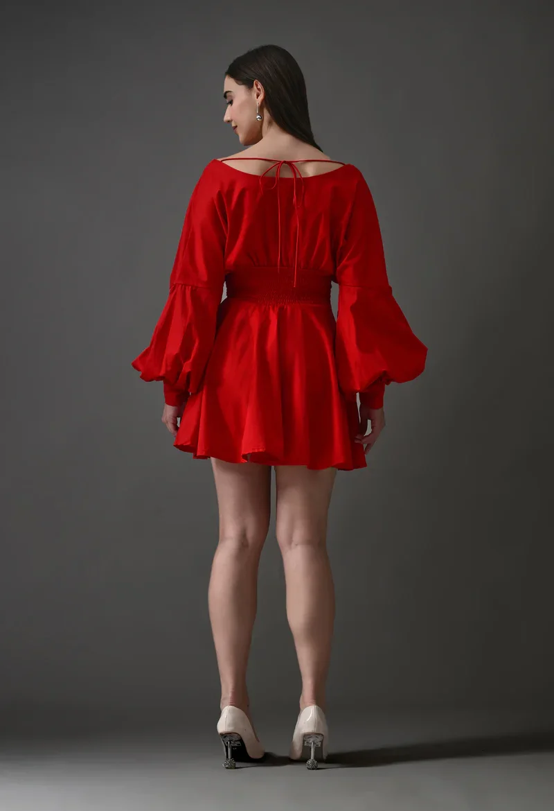 Turn up the heat in this stunning red mini skater dress! The deep V neck and drop shoulder Juliet sleeves create a sultry, feminine look, while the bright red color exudes confidence and sophistication. Whether you're heading to a party, a night out with friends, or a special occasion, this dress is sure to make you feel like a million bucks.