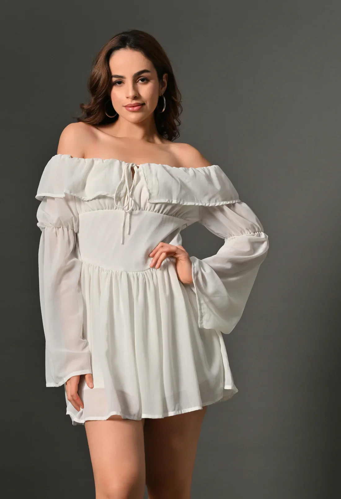 Elevate your style with this stunning White mini skater dress. Featuring bell sleeves, tie detailing at the neck, and a delicate frill, this dress is perfect for anyone who wants to add a touch of sophistication and whimsy to their wardrobe.
