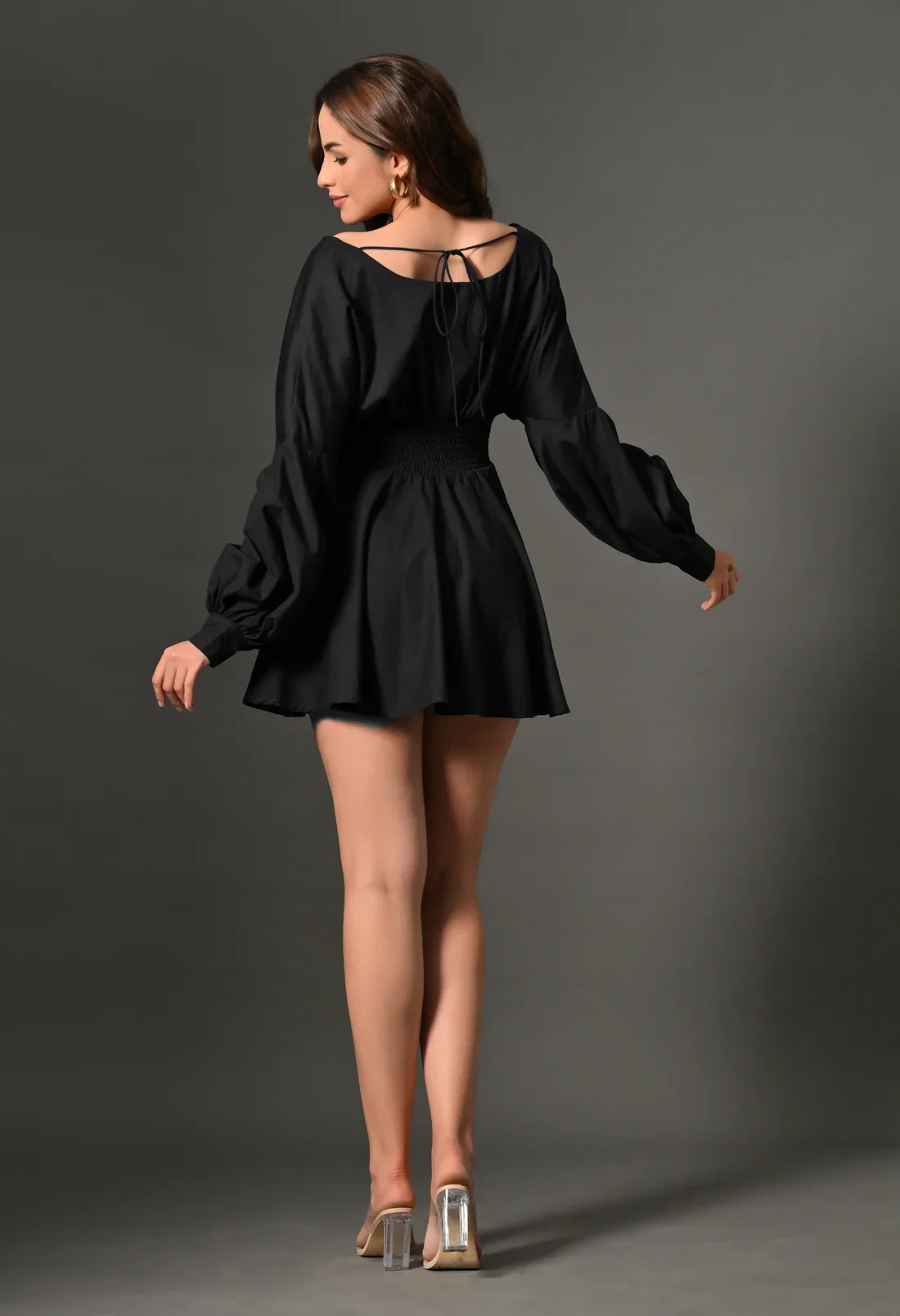 Make a dramatic entrance in this stunning black mini skater dress. The deep V neck and drop shoulder Juliet sleeves add a touch of allure and romance, while the mini length keeps the dress playful and fun.