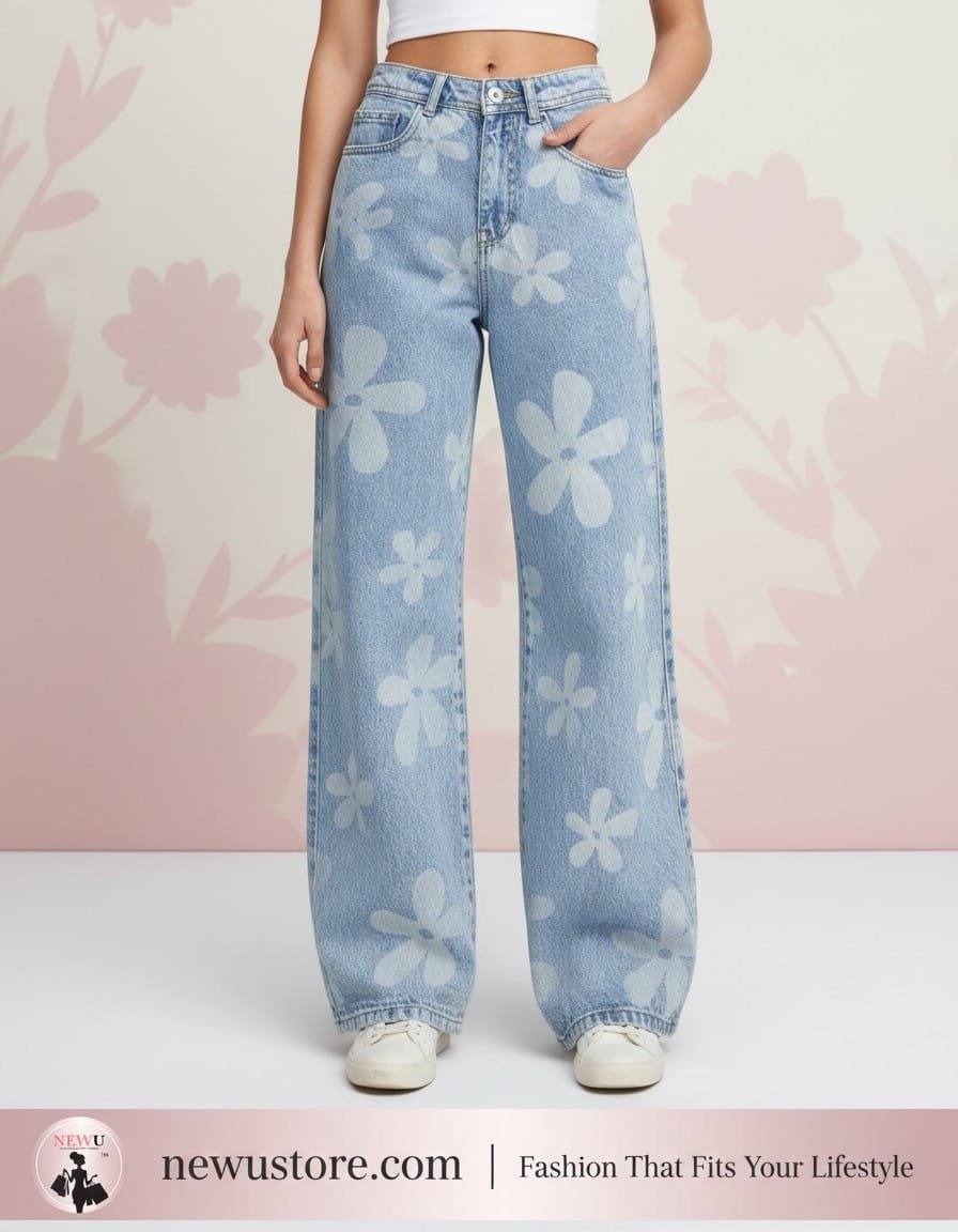 Step into spring with NewU’s Daisy Bloom Wide-Leg Jeans. Featuring a trendy light wash and bold floral patterns, these high-waisted jeans offer a relaxed fit for all-day comfort. Elevate your streetwear game at NewUstore.com.
