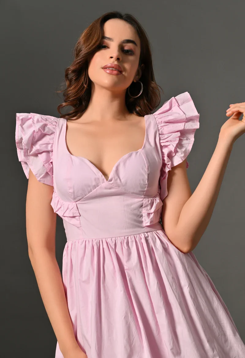 Make a statement in pink mini balloon dress, complete with frill sleeves that give you a playful, butterfly-inspired look. The smocking at the back ensures a comfortable, flexible fit, so you can dance the night away with confidence.