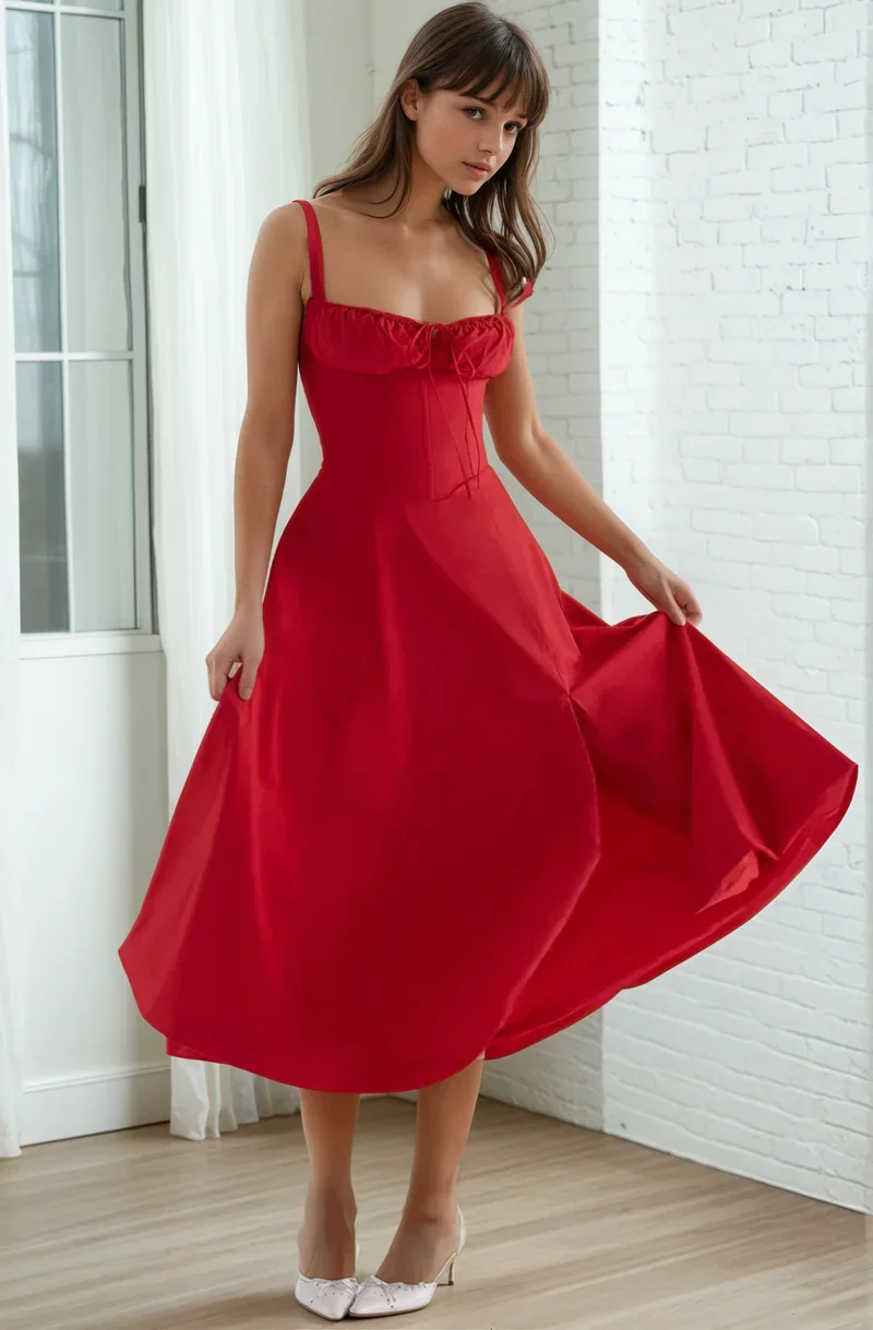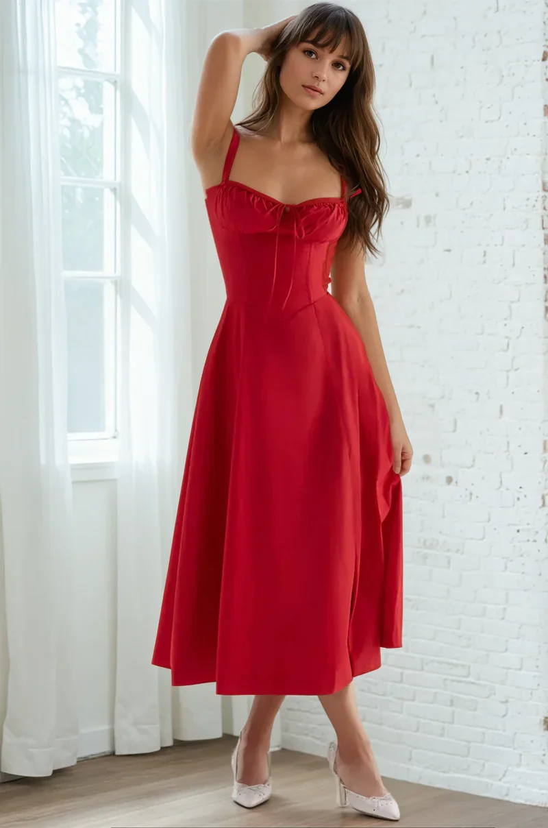 Make a statement in our Red Maxi Cotton Bustier Corset Dress. This stunning dress features a corset-style bodice with a bustier design, perfect for adding a touch of drama and elegance to your wardrobe. Made from comfortable cotton fabric, this maxi dress is ideal for special occasions or everyday wear with a pop of color
